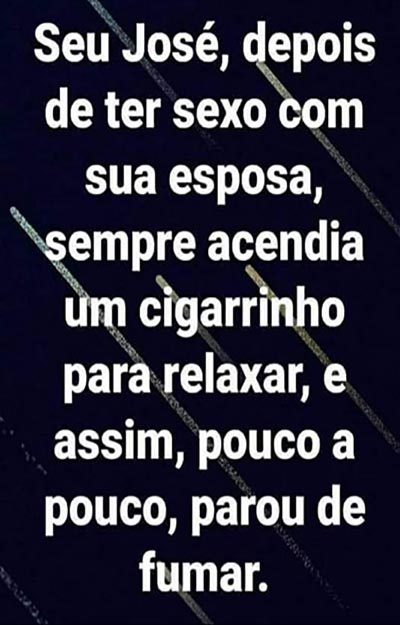 – Veja bem, eu também tive esse tipo de enxaqueca, e o conselho que vou te dar não tem nada a ver com o que aprendi na faculdade de medicina, e sim algo que aprendi com a minha própria experiência de vida. Todas as vezes que eu tinha essas enxaquecas, eu ia para casa, tomava um banho bem quente na banheira e ficava lá por um tempo. Depois a minha esposa me ensaboava e massageava a minha testa com a água quente. Então eu saía da banheira, e mesmo com a cabeça ainda me matando, eu me forçava a fazer amor com minha esposa. E a enxaqueca logo sumia! Então, faça essa tentativa, e volte aqui para me contar o resultado em quatro semanas.