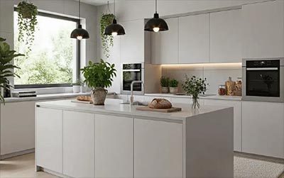 Ela pode ser aplicada nas portas dos armários, em módulos superiores, nichos ou detalhes da marcenaria. O tom claro ajuda a iluminar o ambiente e a criar uma sensação de amplitude, especialmente em cozinhas compactas ou com pouca entrada de luz natural.