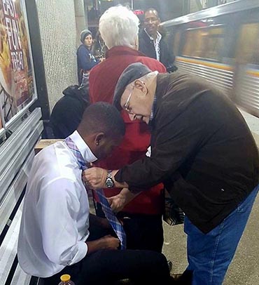 Este jovem estava a caminho de uma entrevista de emprego e teve um pequeno problema com a gravata. A senhora de casaco vermelho notou que o menino estava tentando em vão dar o nó e deu um cotovelo leve ao marido.